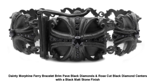 Our model is photographed wearing a Dainty Morphine Ferry Bracelet Brim Pave Black Diamonds & Rose Cut Black Diamond Centers with a Black Matt Stone Finish. Click on the image for larger view. .925 Solid Sterling Silver. Handmade in the U.S.A.