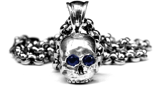 Our model is photographed wearing a Small Gold Skull Pendant (top necklace) with two Medium Skull Pendants. Small Skull Pendants measure 3/4" in height including bail. Click on the image for a larger view. .925 Solid Sterling Silver. Pendants are Handmade in the U.S.A. and chains are made in Italy.